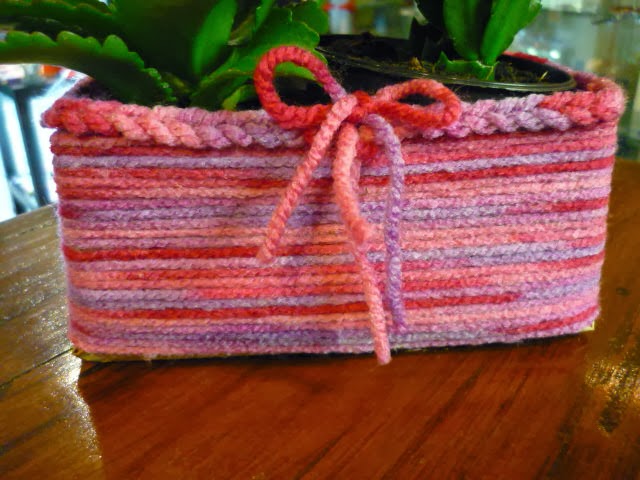 una scatolina di cartone rivestita con del filo di lana multicolore
